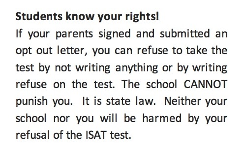 During the ISAT testing window, we fully expect principals and teachers–the adults whom we entrust our children’s care to every day of the school year—to treat our children who opt out with kindness, to allow them to engage in alternative quiet activities during the test, and to respect our wishes as parents and guardians to direct our children’s education. All parents should demand nothing less.