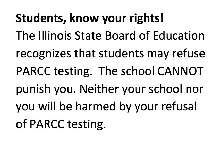 Below are materials you may find useful for yourself and sharing with others during the testing window. [Although we have not updated these for the 2016-2017 school year, there have been no changes in state law or ISBE policy since spring 2016, so almost everything here can be reused for this year. We do recommend that you check Raise Your Hand’s Testing Toolkit for 2017 specific materials and news.]